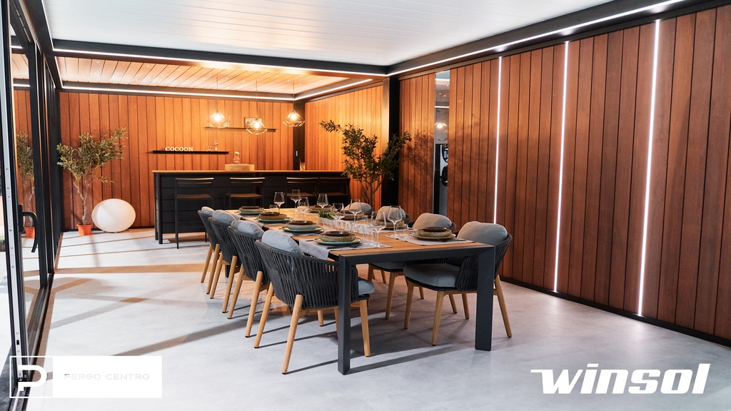 The SO! Cocoon outdoor living space means you can enjoy your patio even more, regardless of the weather and the temperature. At the same time, the wooden ceiling brings a touch of coziness and extra comfort. Can even be coupled with any tilting louvered roof to create a combi